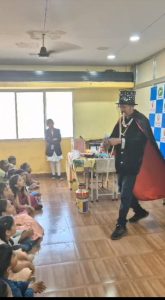 बाल दिवस के इस अवसर पर बच्चों के मनोरंजन के लिए एक विशेष जादूगर का शो भी रखा गया, जिसमें बच्चों ने बड़े उत्साह के साथ भाग लिया। रंग-बिरंगे और अद्भुत जादू के करतबों ने बच्चों का भरपूर मनोरंजन किया और उनकी आंखों में खुशी की चमक बिखेरी। इसके अलावा, संजय सर ने बच्चों के लिए कुछ रोचक और मजेदार गूगली प्रश्न पूछे, जिनका उत्तर देते हुए बच्चों ने हंसी-खुशी का माहौल बना दिया। संजय सर के गूगली प्रश्नों ने बच्चों की सोचने-समझने की क्षमता को चुनौती दी और उनमें उत्साह भर दिया।
